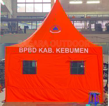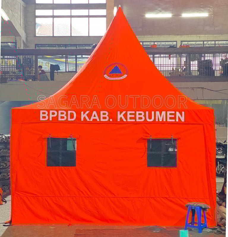 Tenda posko kerucut BPBD adalah tenda lapangan berbentuk kerucut yang digunakan oleh Badan Penanggulangan Bencana Daerah (BPBD) sebagai pusat kegiatan tanggap darurat di lokasi bencana. Dengan desain atap tinggi berbentuk kerucut, tenda ini memiliki sirkulasi udara yang baik, ruang yang luas, serta mudah dikenali dari kejauhan sebagai posko utama koordinasi dan pelayanan masyarakat.